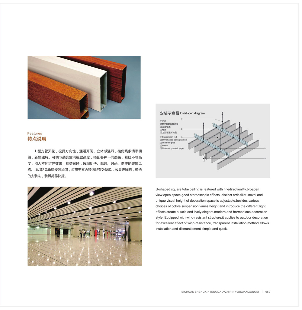 U型?管天花,極具?向性,通透開闊,?體感強烈,棱?線條清晰明朗,新穎獨特??烧{節(jié)裝飾空間視覺?度,搭配各種不同顏?,懸掛不等?度,引?不同燈光效果,相益輝映,展現(xiàn)明快、飄逸、時尚、諧美的裝飾?格。加以防??碼安裝加固,應?于室內裝飾能有效防?,效果更鮮明,通透的安裝法,裝拆簡易快捷。